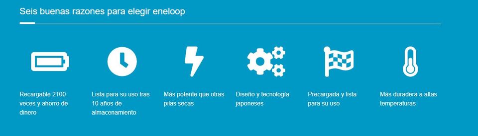 ¡Las pilas recargables eneloop son un ejemplo de energía renovable: se pueden cargar hasta 2100 veces! Utilizar las pilas recargables eneloop le ayudará a reducir el índice de desechos y así contribuir a cuidar el medio ambiente. Mantengamos las pilas fuera de los vertederos.