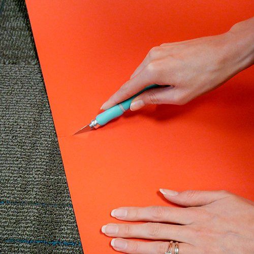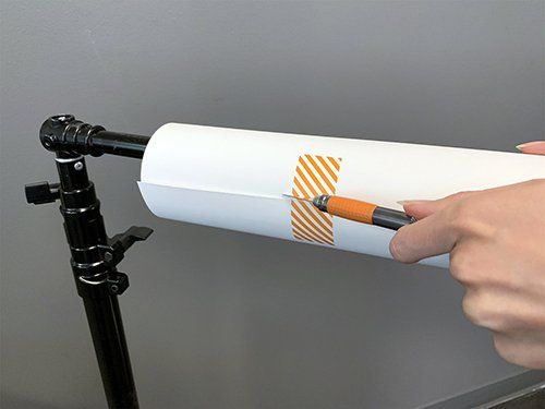 1- Coloque el rollo de cartulina en el suelo, de modo que el borde cortado quede en la parte inferior del rollo y hacia usted. Levante con cuidado el fondo con ambas manos y sosténgalo horizontalmente (no corte la cinta del borde libre antes de realizar este paso).