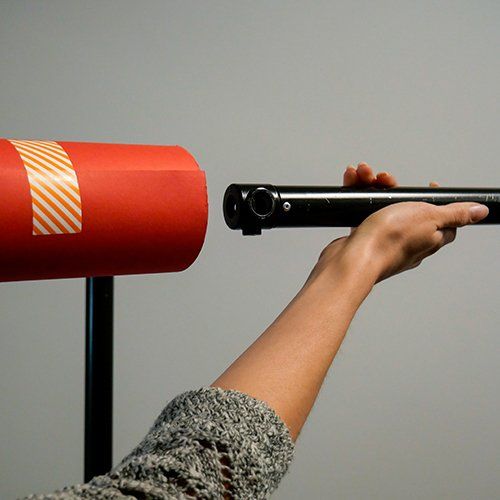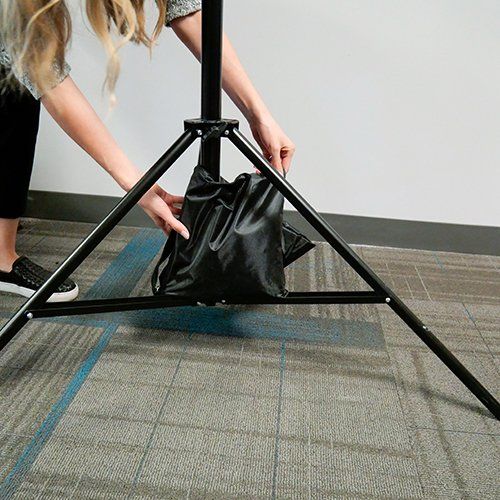 3. Extienda las patas del soporte y colóquelas dos de ellas hacia la parte trasera del rollo (alineadas con el mismo rollo de cartulina) y la tercera pata, orientada en la dirección en la que se extenderá el rollo. Pese la base de cada soporte con una bolsa de arena. Todo el peso del saco de arena debe descansar sobre las patas de la base del montante, no sobre el piso. Esto mantendrá el fondo estable. Si está usando un fondo extra grande, use dos o más sacos de arena para cada vertical. Verifique el límite de peso máximo de su portafondos, establecido por el fabricante, para asegurarse de que pueda soportar de manera segura su fondo.