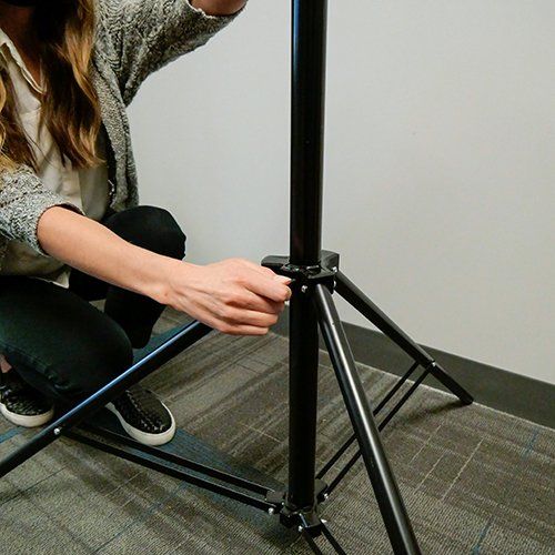 3. Extienda las patas del soporte y colóquelas dos de ellas hacia la parte trasera del rollo (alineadas con el mismo rollo de cartulina) y la tercera pata, orientada en la dirección en la que se extenderá el rollo. Pese la base de cada soporte con una bolsa de arena. Todo el peso del saco de arena debe descansar sobre las patas de la base del montante, no sobre el piso. Esto mantendrá el fondo estable. Si está usando un fondo extra grande, use dos o más sacos de arena para cada vertical. Verifique el límite de peso máximo de su portafondos, establecido por el fabricante, para asegurarse de que pueda soportar de manera segura su fondo.